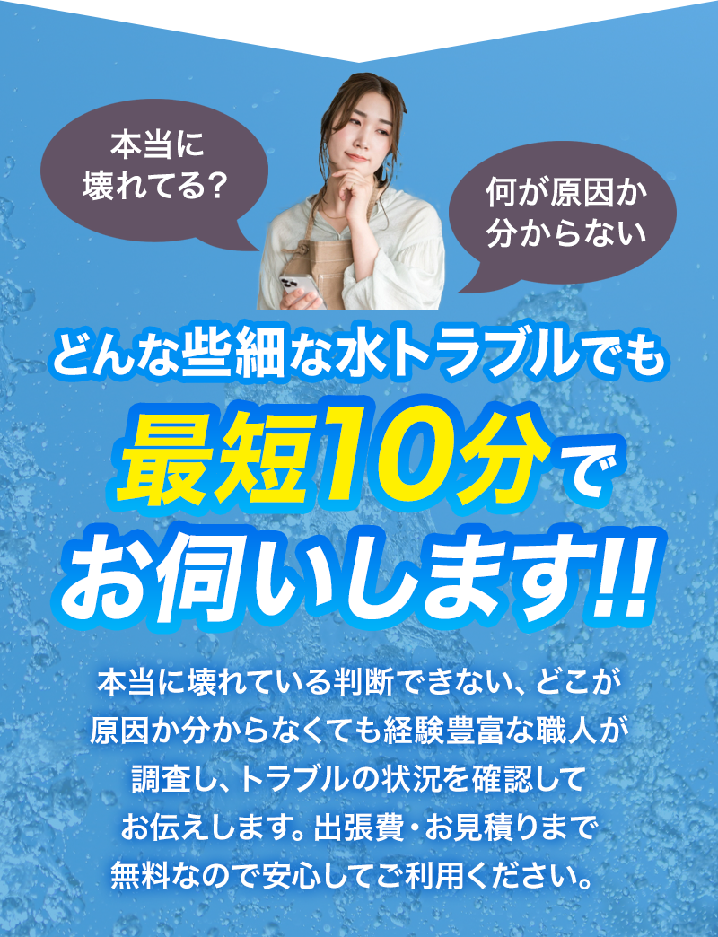 緊急の水トラブルでも深夜・早朝、土日祝日関わらず経験豊富な職人がすぐ駆けつけ確実に修理します。 -
